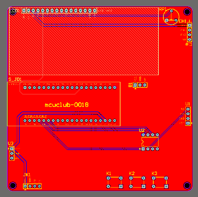 PCB图是由原理图导出,封装很大一部分都是作者自己绘制,不提供封装库,只提供连接好的源文件,可以直接在嘉立创进行打板。两层板,上下覆铜接地。