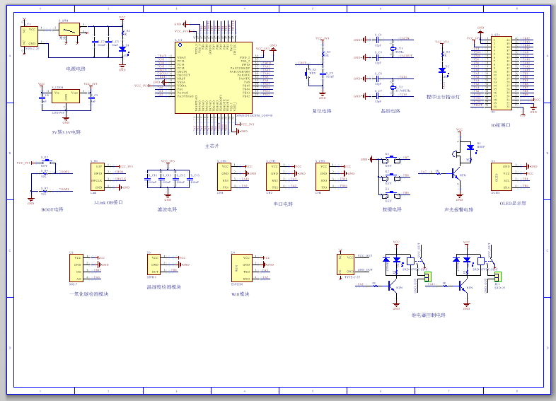PCB图是由原理图导出,封装很大一部分都是作者自己绘制,不提供封装库,只提供连接好的源文件,可以直接在嘉立创进行打板。两层板,上下覆铜接地。