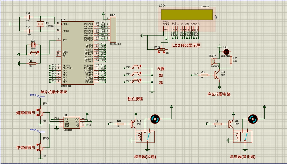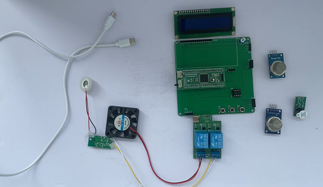 1、通过MQ-2模块检测烟雾值,当烟雾值大于设置最大值时开启风扇和净化器,同时进行声光报警提醒