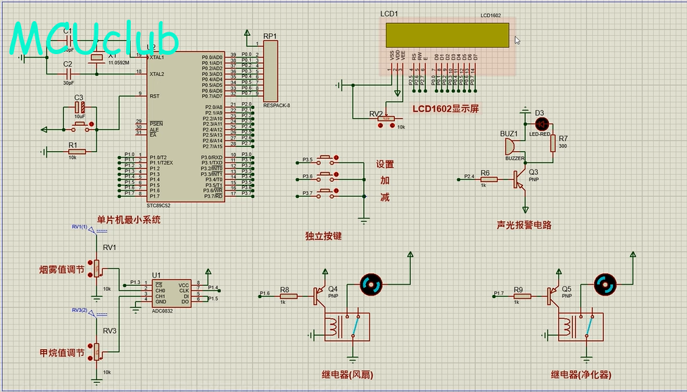 3、通过按键设置烟雾及甲烷最大值,另外,当烟雾值小于等于设置最大值并且甲烷值小于等于设置最大值时,可手动控制风扇或净化器开关