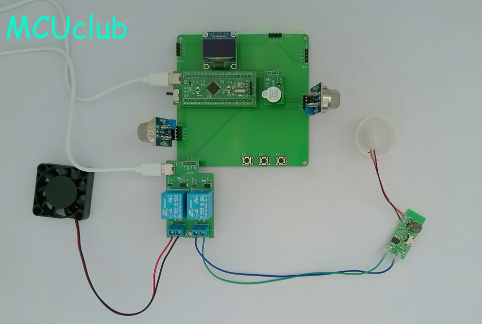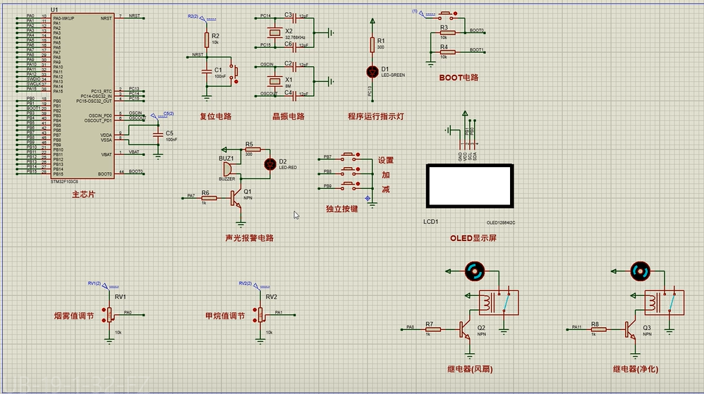 1、通过MQ-2模块检测烟雾值,当烟雾值大于设置最大值时开启风扇和净化器,同时进行声光报警提醒