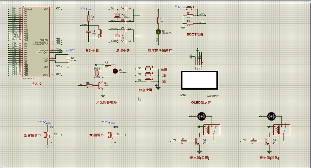 2、通过MQ-7模块检测CO值,当CO值大于设置最大值时开启风扇和净化器,同时进行声光报警提醒