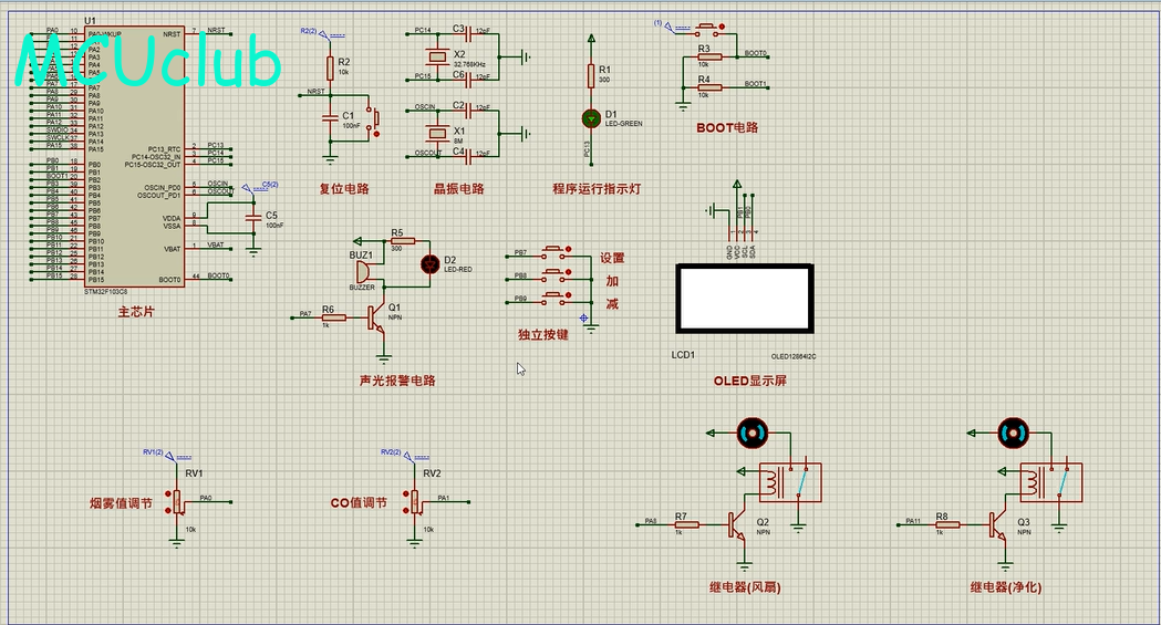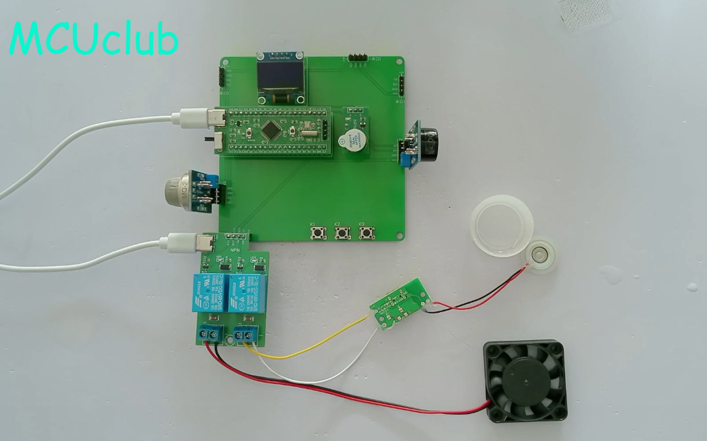 1、通过MQ-2模块检测烟雾值,当烟雾值大于设置最大值时开启风扇和净化器,同时进行声光报警提醒