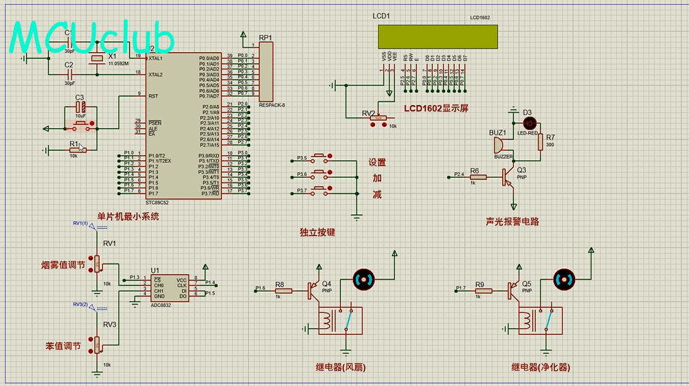 3、通过按键设置烟雾及苯气体最大值,另外,当烟雾值小于等于设置最大值并且苯气体值小于等于设置最大值时,可手动控制风扇或净化器开关