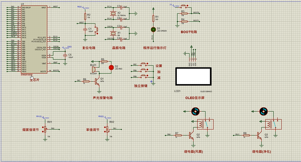 3、通过按键设置烟雾及苯气体最大值,另外,当烟雾值小于等于设置最大值并且苯气体值小于等于设置最大值时,可手动控制风扇或净化器开关