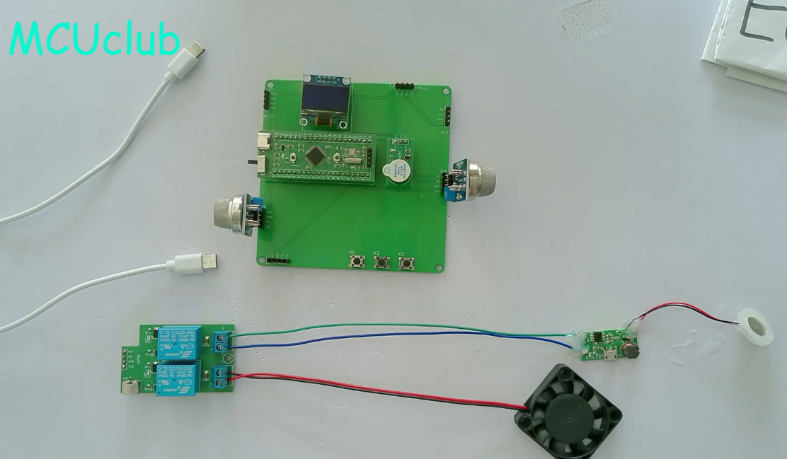 1、通过MQ-2模块检测烟雾值,当烟雾值大于设置最大值时开启风扇和净化器,同时进行声光报警提醒