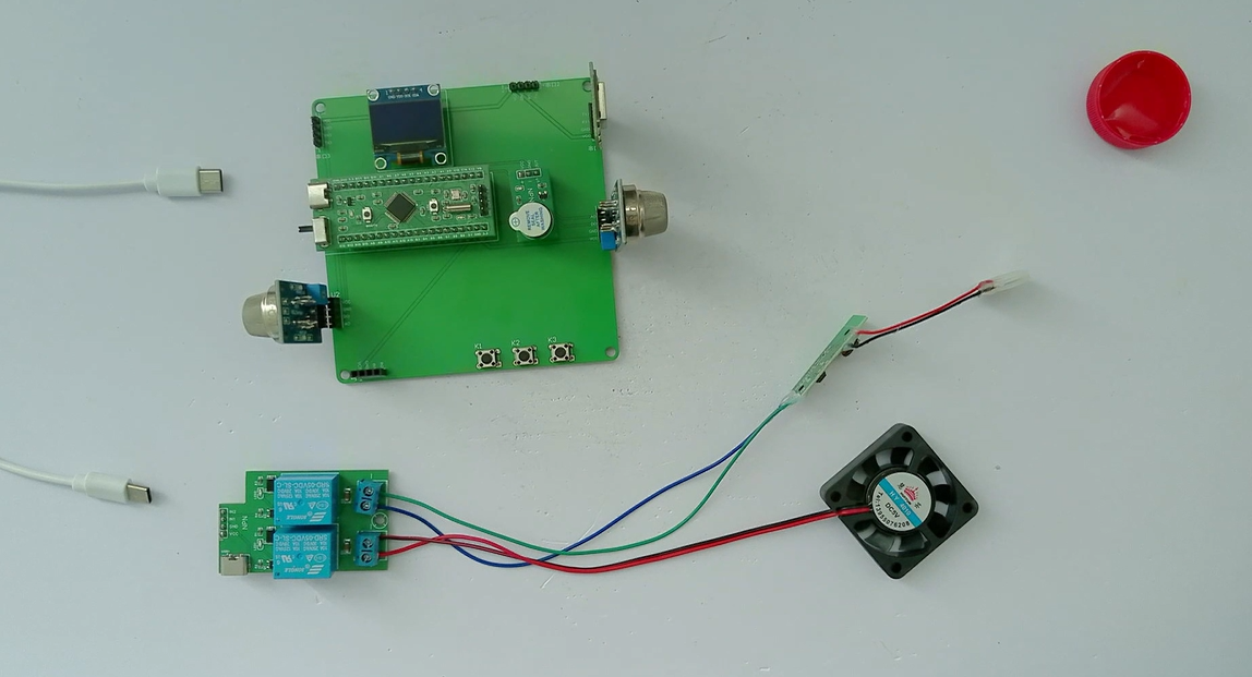 1、通过MQ-2模块检测烟雾值,当烟雾值大于设置最大值时开启风扇和净化器,同时进行声光报警提醒