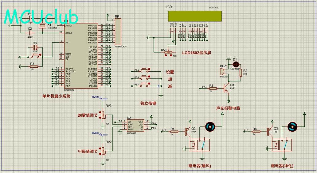2、通过MS1100模块检测甲醛值,当甲醛值大于设置最大值时开启风扇和净化器,同时进行声光报警提醒