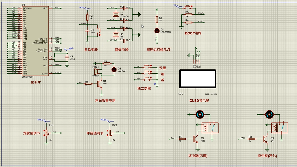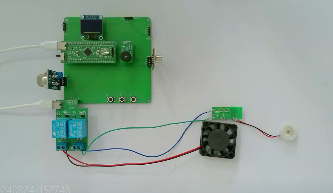3、通过按键设置烟雾及甲醛最大值,另外,当烟雾值小于等于设置最大值并且甲醛值小于等于设置最大值时,可手动控制风扇或净化器开关