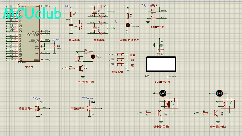 2、通过MS1100模块检测甲醛值,当甲醛值大于设置最大值时开启风扇和净化器,同时进行声光报警提醒