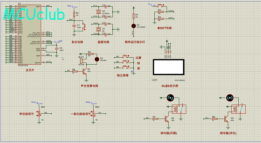 2、通过MQ-7模块检测CO值,当CO值大于设置最大值时开启风扇和净化器,同时进行声光报警提醒