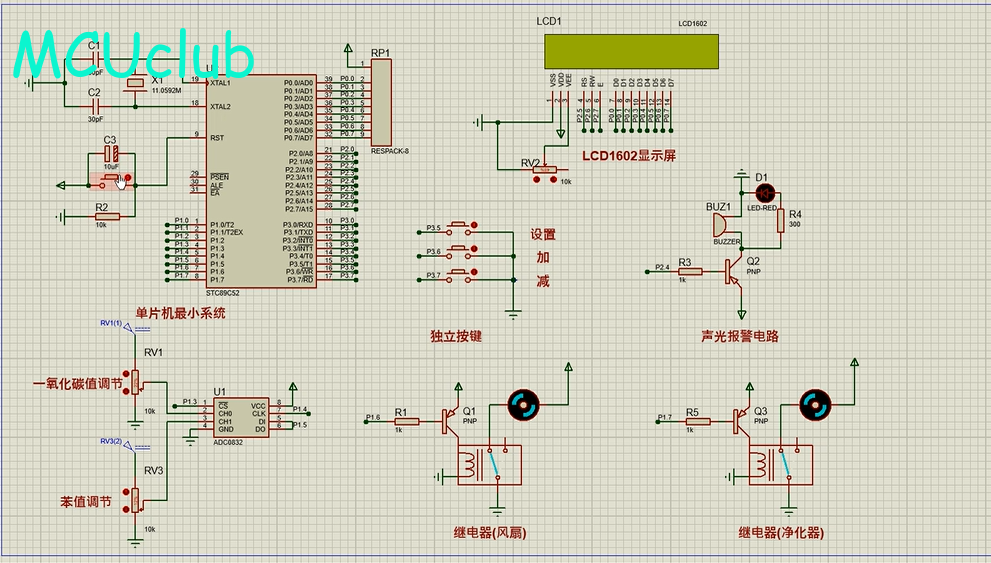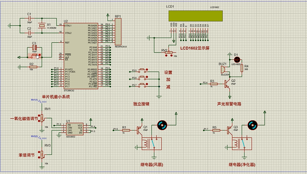 1、通过MQ-7模块检测CO值,当CO值大于设置最大值时开启风扇和净化器,同时进行声光报警提醒