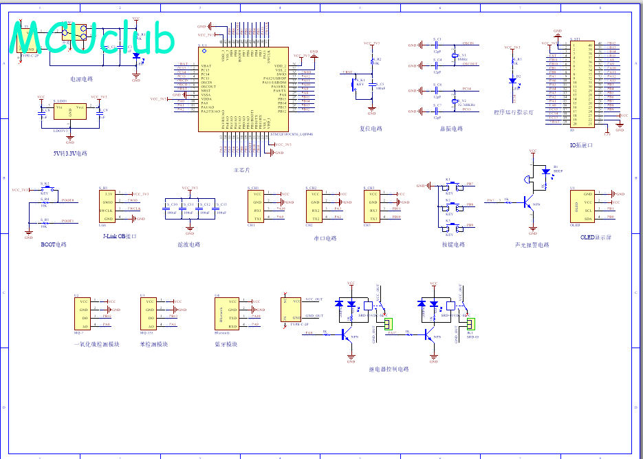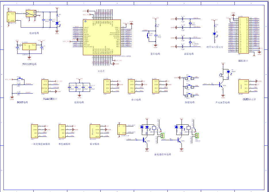 PCB图是由原理图导出,封装很大一部分都是作者自己绘制,不提供封装库,只提供连接好的源文件,可以直接在嘉立创进行打板。两层板,上下覆铜接地。