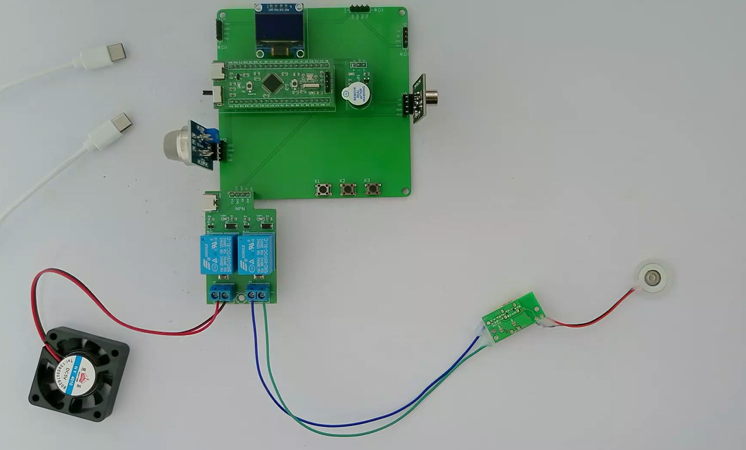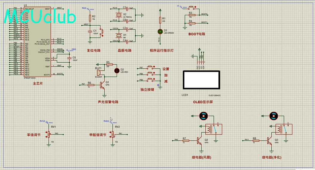 1、通过MQ-135模块检测苯气体值,当苯气体值大于设置最大值时开启风扇和净化器,同时进行声光报警提醒