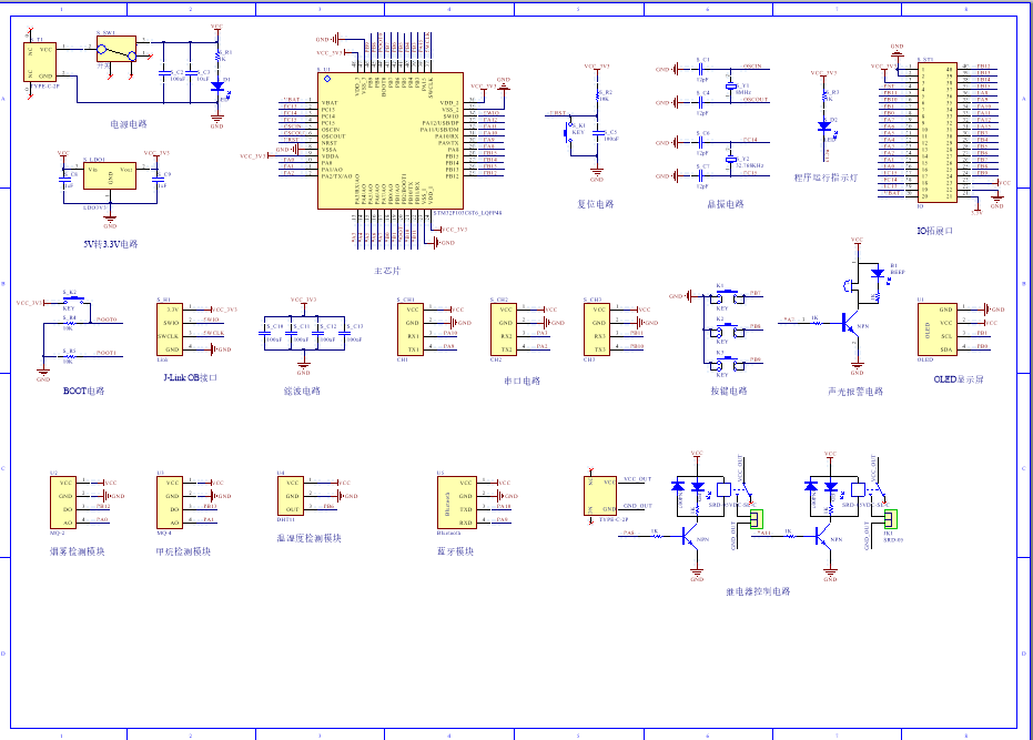 PCB图是由原理图导出,封装很大一部分都是作者自己绘制,不提供封装库,只提供连接好的源文件,可以直接在嘉立创进行打板。两层板,上下覆铜接地。