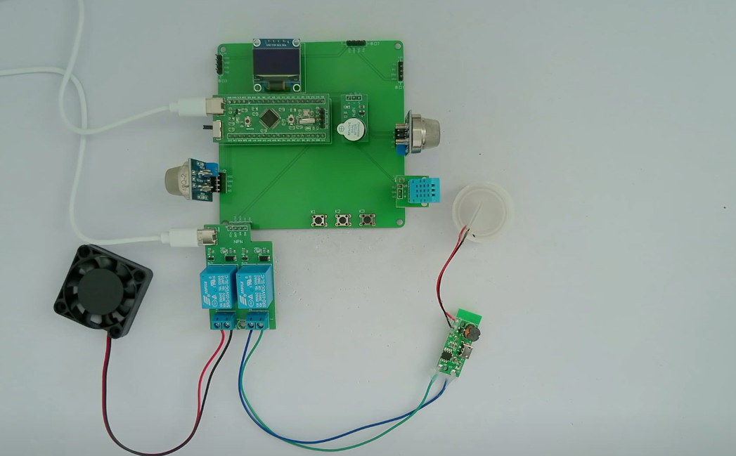 2、通过MQ-2模块检测烟雾值,当烟雾值大于设置最大值时开启风扇和净化器,同时进行声光报警提醒