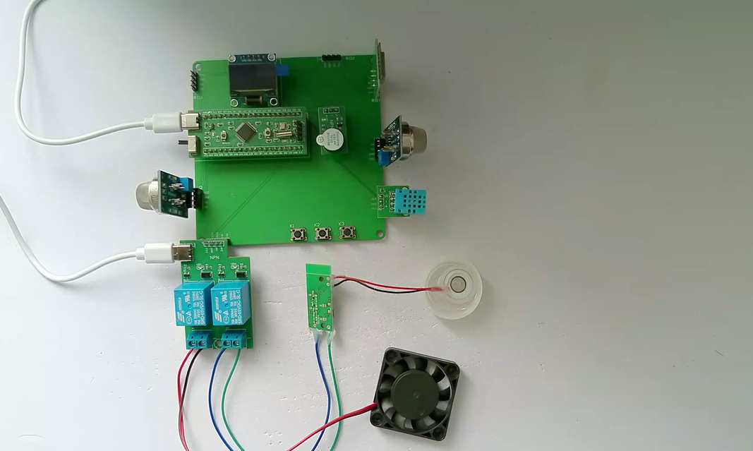 2、通过MQ-2模块检测烟雾值,当烟雾值大于设置最大值时开启风扇和净化器,同时进行声光报警提醒