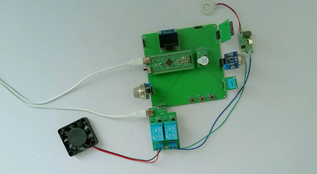 2、通过MQ-2模块检测烟雾值,当烟雾值大于设置最大值时开启风扇和净化器,同时进行声光报警提醒