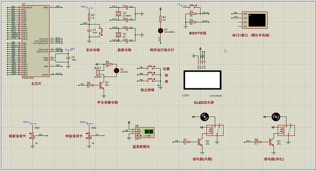 4、通过按键设置温湿度上下限值、烟雾及甲醛最大值,另外,当烟雾值小于等于设置最大值并且甲醛值小于等于设置最大值时,可手动控制风扇或净化器开关