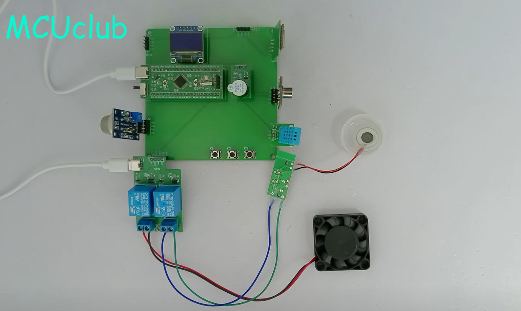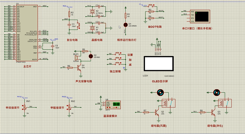 3、通过MS1100模块检测甲醛值,当甲醛值大于设置最大值时开启风扇和净化器,同时进行声光报警提醒
