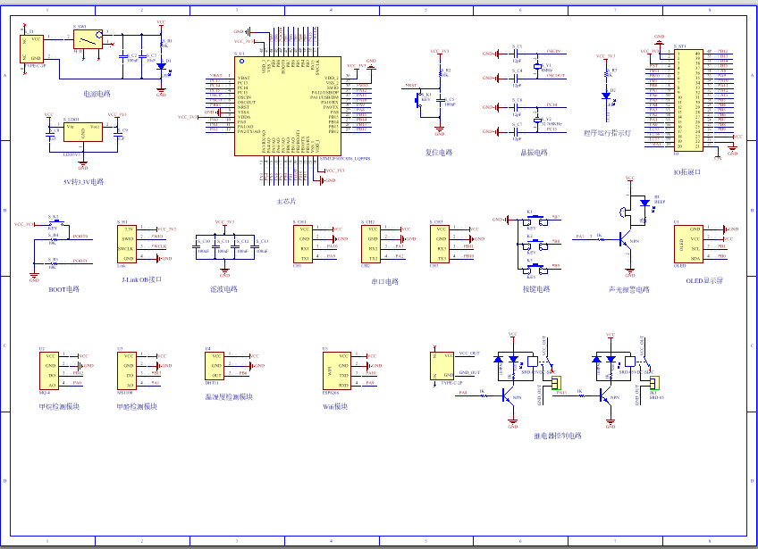 PCB图是由原理图导出,封装很大一部分都是作者自己绘制,不提供封装库,只提供连接好的源文件,可以直接在嘉立创进行打板。两层板,上下覆铜接地。