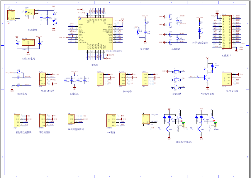 PCB图是由原理图导出,封装很大一部分都是作者自己绘制,不提供封装库,只提供连接好的源文件,可以直接在嘉立创进行打板。两层板,上下覆铜接地。