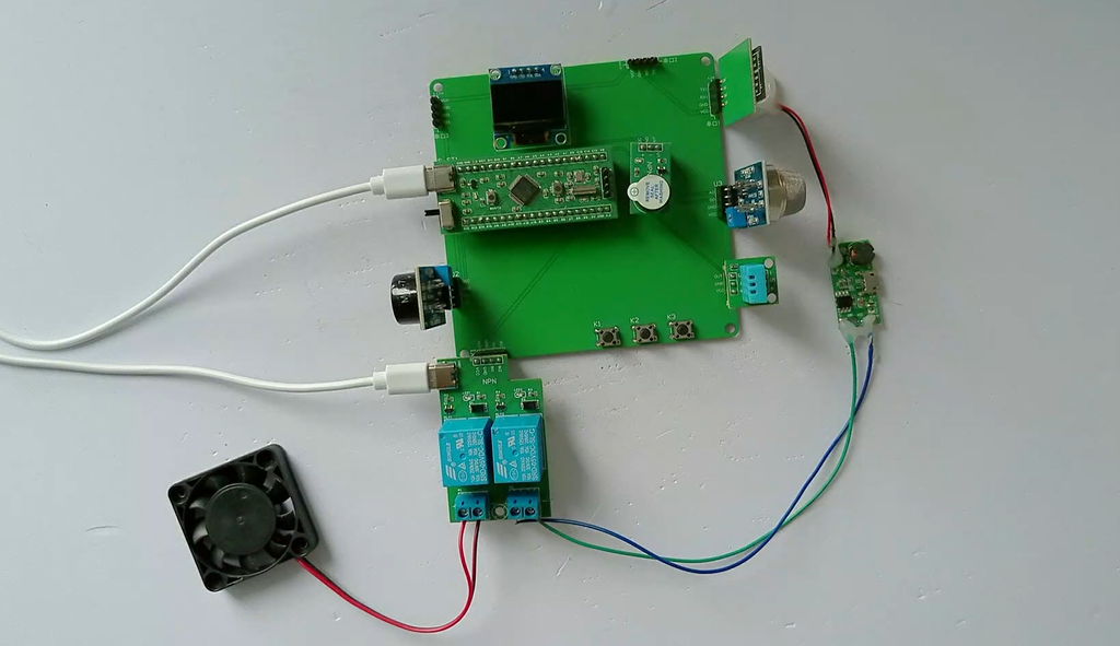 3、通过MQ-135模块检测苯气体值,当苯气体值大于设置最大值时开启风扇和净化器,同时进行声光报警提醒