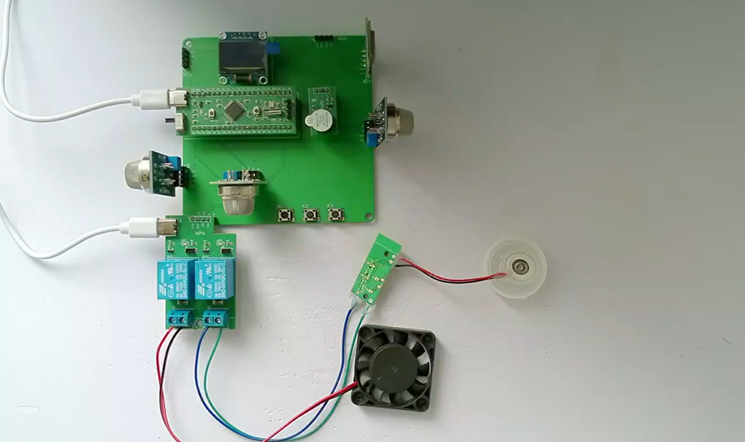 3、通过MQ-135模块检测苯气体值,当苯气体值大于设置最大值时开启风扇和净化器,同时进行声光报警提醒