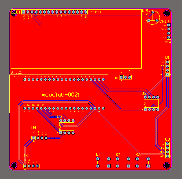 PCB图是由原理图导出,封装很大一部分都是作者自己绘制,不提供封装库,只提供连接好的源文件,可以直接在嘉立创进行打板。两层板,上下覆铜接地。