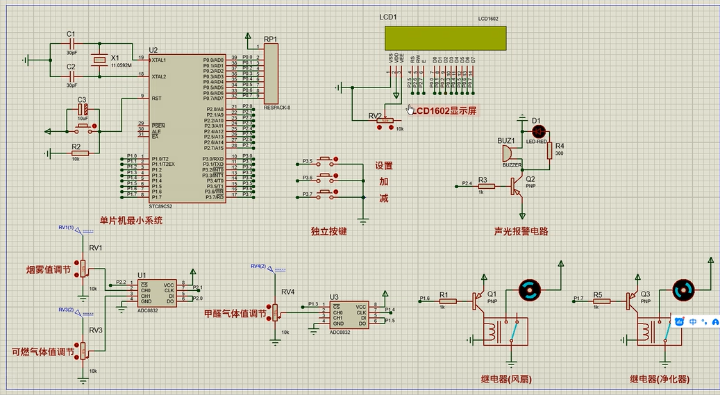 4、通过按键设置烟雾、可燃气体及甲醛最大值,另外,当烟雾值、可燃气体值及甲醛值小于等于设置最大值时,可手动控制风扇或净化器开关
