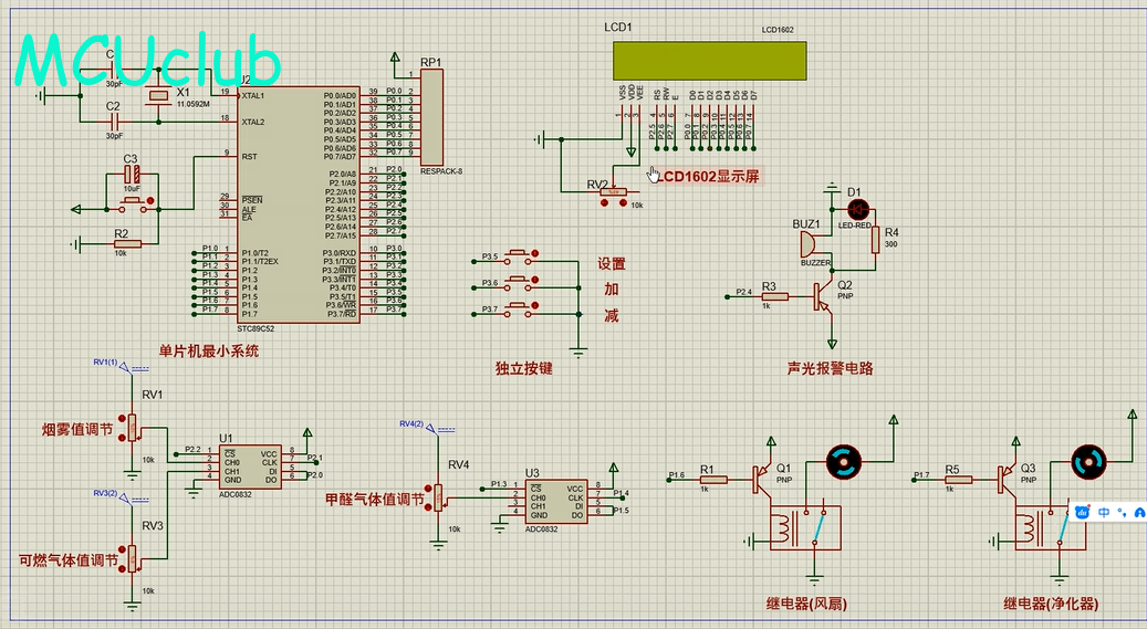3、通过MS1100模块检测甲醛值,当甲醛值大于设置最大值时开启风扇和净化器,同时进行声光报警提醒