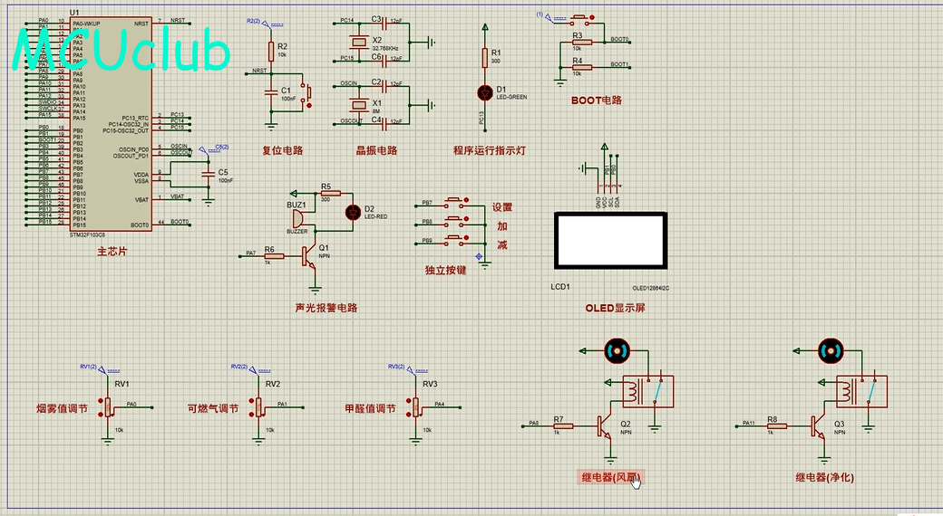 3、通过MS1100模块检测甲醛值,当甲醛值大于设置最大值时开启风扇和净化器,同时进行声光报警提醒