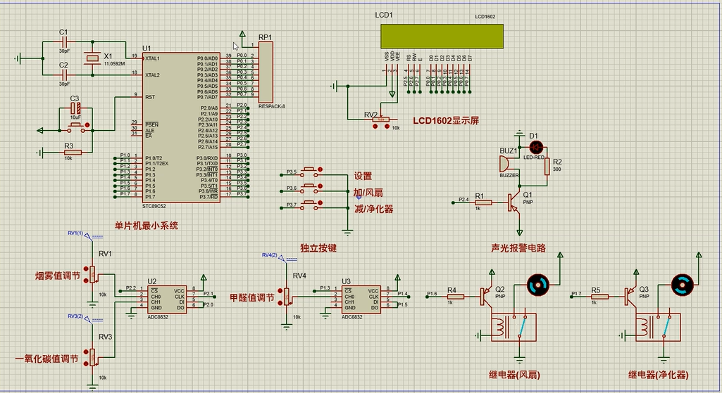 4、通过按键设置烟雾、CO及甲醛最大值,另外,当烟雾值、CO值及甲醛值小于等于设置最大值时,可手动控制风扇或净化器开关