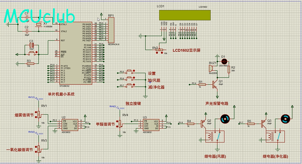 3、通过MS1100模块检测甲醛值,当苯气体值大于设置最大值时开启风扇和净化器,同时进行声光报警提醒