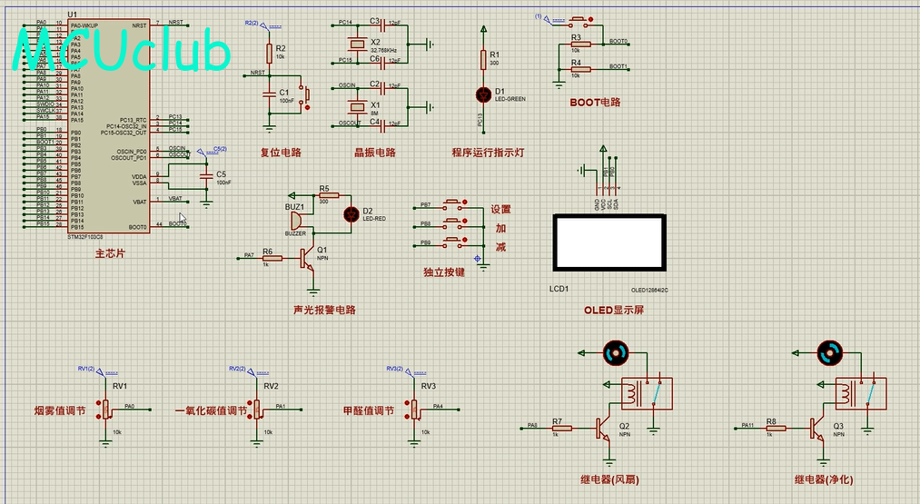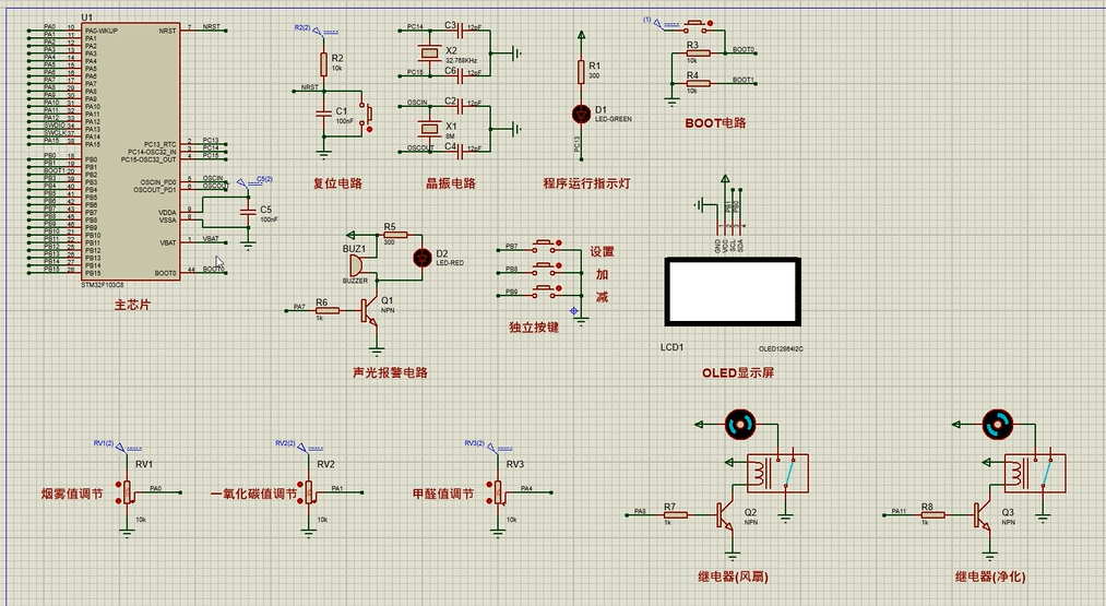 3、通过MS1100模块检测甲醛值,当甲醛气体值大于设置最大值时开启风扇和净化器,同时进行声光报警提醒