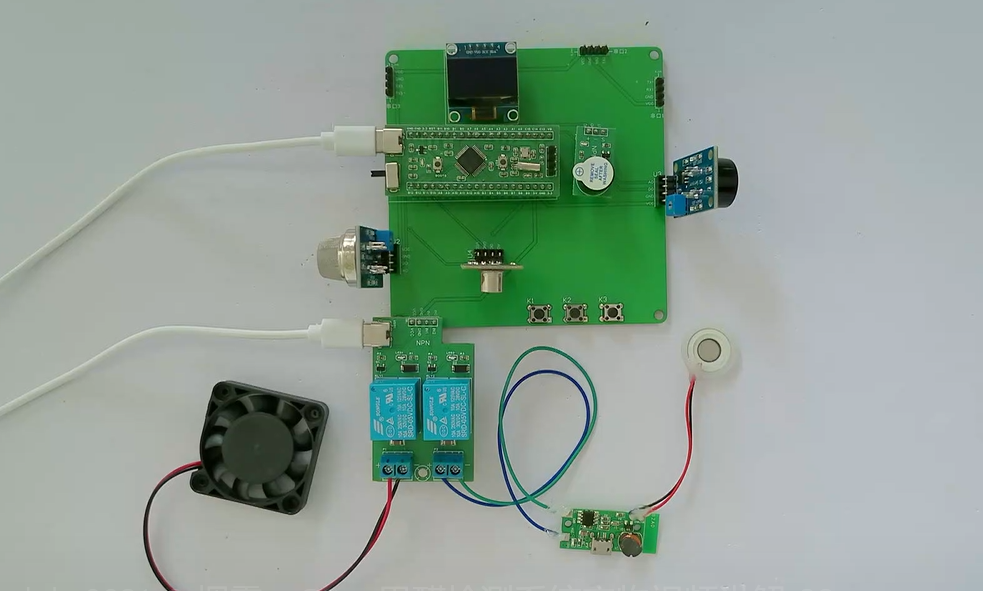 1、通过MQ-2模块检测烟雾值,当烟雾值大于设置最大值时开启风扇和净化器,同时进行声光报警提醒