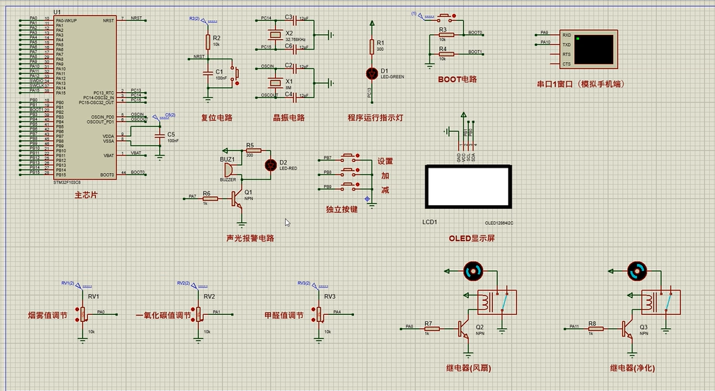 3、通过MS1100模块检测甲醛值,当苯气体值大于设置最大值时开启风扇和净化器,同时进行声光报警提醒