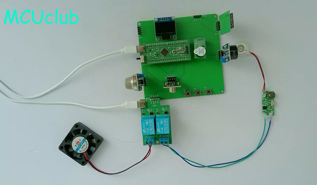 1、通过MQ-2模块检测烟雾值,当烟雾值大于设置最大值时开启风扇和净化器,同时进行声光报警提醒