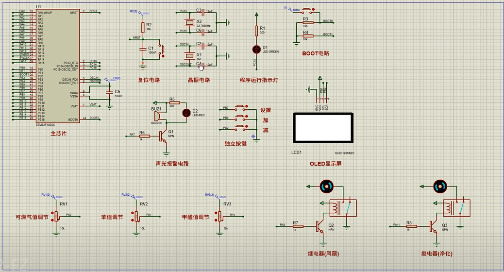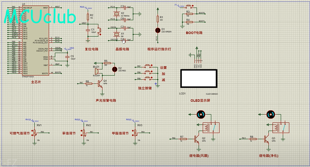 3、通过MS1100模块检测甲醛值,当甲醛值大于设置最大值时开启风扇和净化器,同时进行声光报警提醒