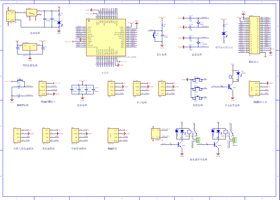 PCB图是由原理图导出,封装很大一部分都是作者自己绘制,不提供封装库,只提供连接好的源文件,可以直接在嘉立创进行打板。两层板,上下覆铜接地。