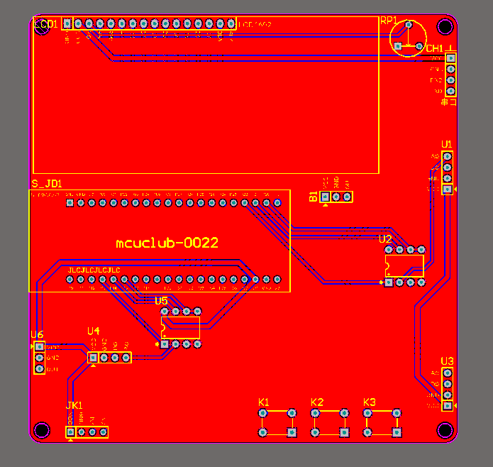 PCB图是由原理图导出,封装很大一部分都是作者自己绘制,不提供封装库,只提供连接好的源文件,可以直接在嘉立创进行打板。两层板,上下覆铜接地。