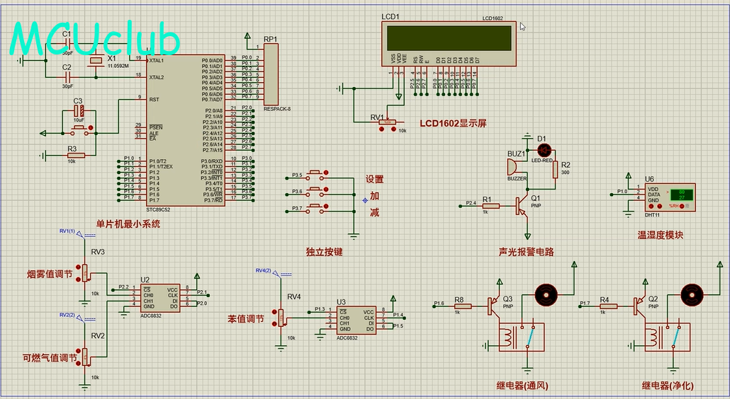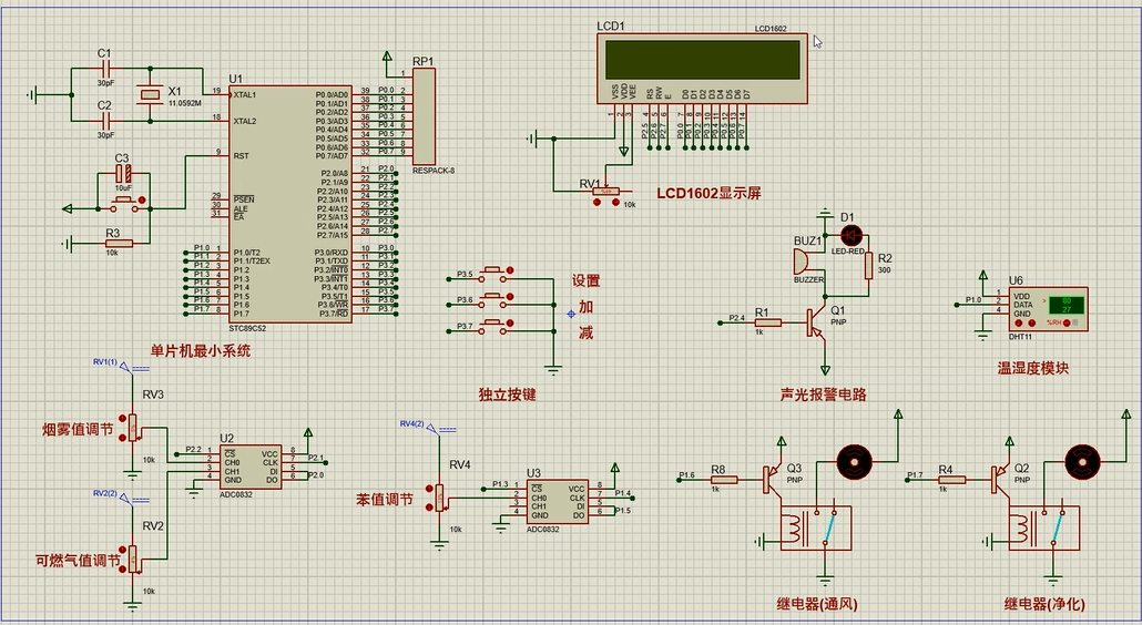 5、通过按键设置温湿度上下限值、烟雾、可燃气体及苯气体最大值,另外,当烟雾值、可燃气体值及苯气体值小于等于设置最大值时,可手动控制风扇或净化器开关
