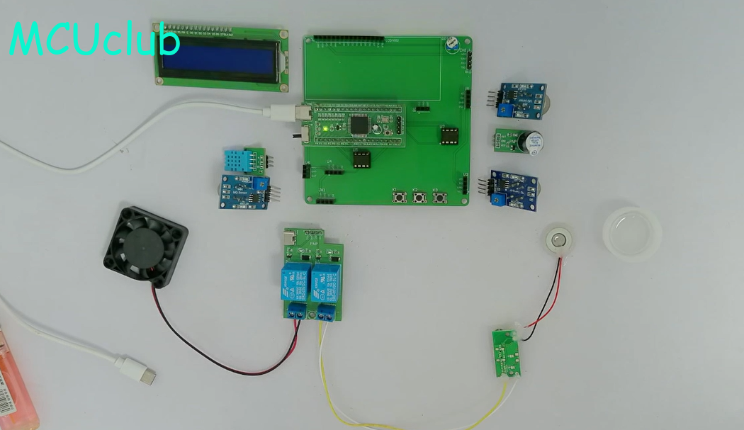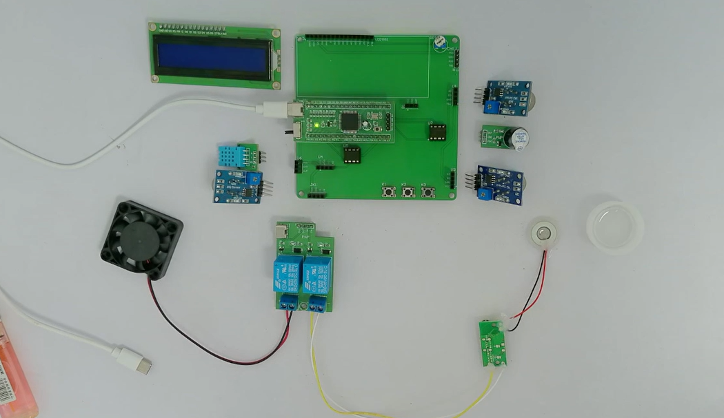 2、通过MQ-2模块检测烟雾值,当烟雾值大于设置最大值时开启风扇和净化器,同时进行声光报警提醒
