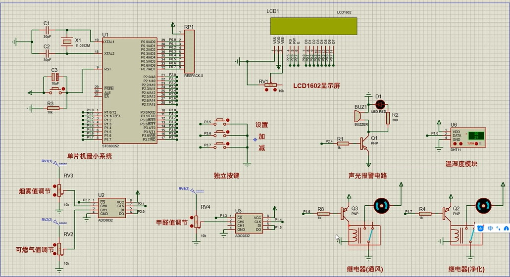 4、通过MS1100模块检测甲醛值,当甲醛值大于设置最大值时开启风扇和净化器,同时进行声光报警提醒