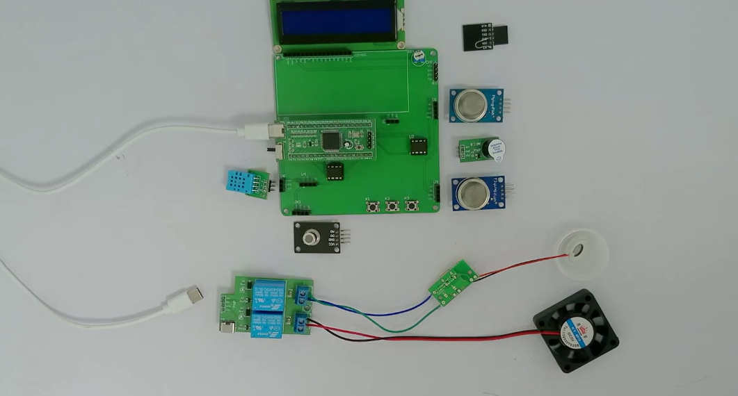 2、通过MQ-2模块检测烟雾值,当烟雾值大于设置最大值时开启风扇和净化器,同时进行声光报警提醒
