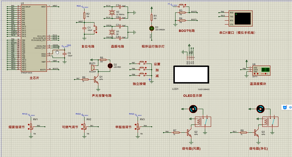 4、通过MS1100模块检测甲醛值,当甲醛值大于设置最大值时开启风扇和净化器,同时进行声光报警提醒