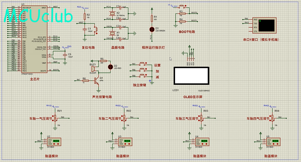 2、通过4个温度检测模块监测4个汽车轮胎的温度,当任意一个温度大于设置的最大值时,进行声光报警提醒