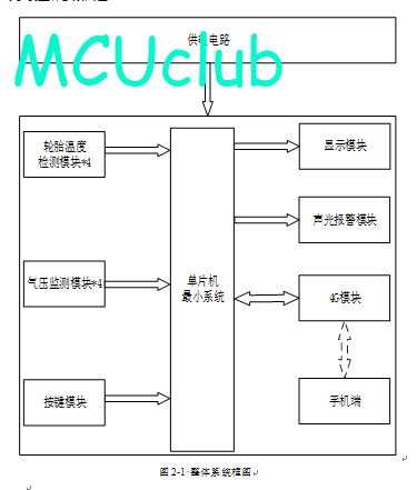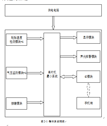 1、通过4个气压检测模块监测4个汽车轮胎的胎压,当任意一个胎压不在设置的范围内时,进行声光报警提醒